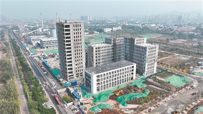 在李沧区德江路5号,老碱厂的元素还未完全消散,一面外墙依然留有“青岛碱业股份有限公司”的字样,但墙内已“腾笼换鸟”——原来的碱厂水泥厂位置上,5栋工业楼宇已全部封顶,正在进行外墙保温和窗户安装,这里便是青岛智谷·粤浦科技创新中心项目。项目首期占地43亩,预计2025年6月正式开园。