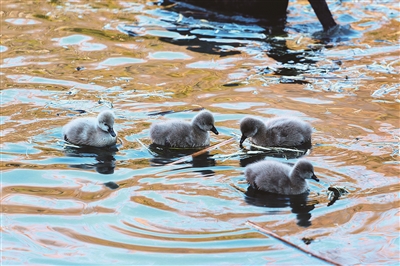 每天上午,随着气温升高,在黑天鹅夫妇的精心呵护下,4只毛茸茸的小天鹅走出窝巢,小心翼翼地在湖面上觅食。远远望去,就像一个个灰色小绒球在水面游动,憨态可掬、惹人喜爱。