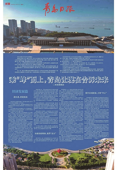 进入2019年,刚刚经历过上合组织青岛峰会的召开,站在改革开放40周年节点上的青岛正开启崭新的征程。2019年1月18日至22日,青岛市两会召开,擘画未来发展蓝图。青岛日报于1月21日推出“乘‘峰’而上,青岛让现在告诉未来”封面版。