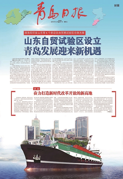 2019年8月26日,国务院印发山东等6个新设自贸区总体方案,根据方案,山东自贸区涵盖济南、青岛、烟台三个片区。为记录这一重要事件,青岛日报8月27日推出封面版。