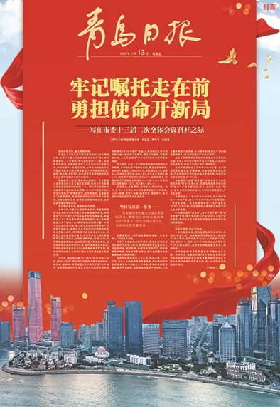 | 2022年11月13日,中共青岛市委十三届二次全体会议举行。青岛日报当日推出封面版。 |