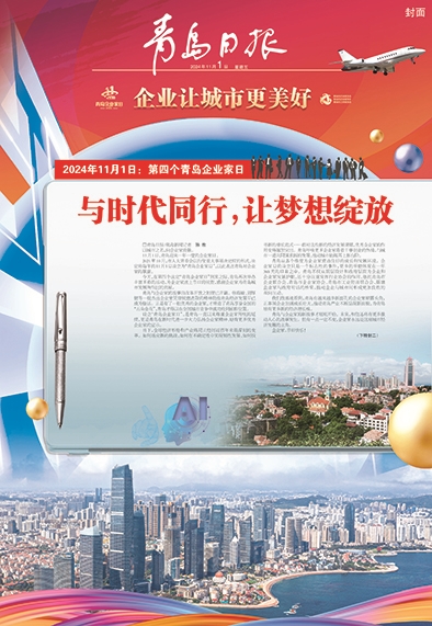 | 2024年11月1日,青岛迎来一年一度的“青岛企业家日”。青岛举办丰富多彩的活动,为企业家送上节日祝贺,感谢企业家为青岛城市发展所作出的贡献。青岛日报当日推出以“与时代同行,让梦想绽放”为主题的封面版。 |