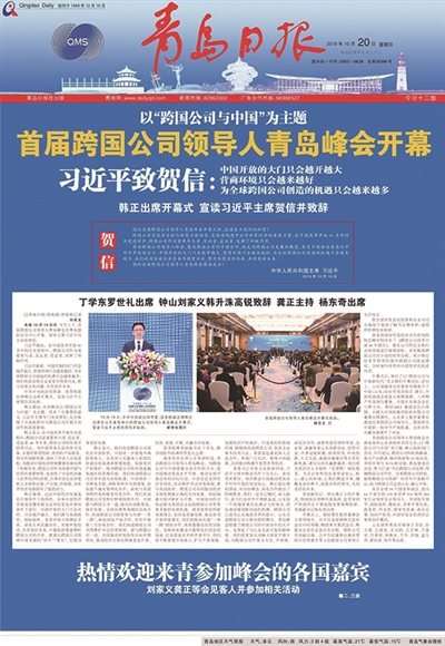 | 连续5年顶格报道跨国公司领导人青岛峰会 2019年,跨国公司领导人青岛峰会首次举办。《青岛日报》连续两天推出封面版等13个专版,刊发社论、评论员文章等稿件,聚焦青岛在国家扩大高水平开放战略中的独特地位。此后,《青岛日报》将每一届跨国公司领导人青岛峰会的宣传报道作为工作重点,成立报道组,推出封面、消息、评论、侧记、专版、观象山“六大件”顶格宣传。 |