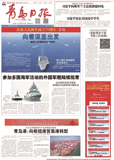 | 人民海军成立70周年多国海军活动报道 2019年4月,青岛成为人民海军成立70周年多国海军活动的主场,迎来了61个国家的海军代表团、13国的18艘军舰。《青岛日报》精心推出新闻报道,全方位呈现海军节盛况。4月23日推出“八连版”·号外珍藏版,集中推介青岛,展现人民海军发展成就,受到海军宣传部门高度肯定。24日、25日推出封面版,同时推出系列特刊16个版。精心编辑制作媒体报道手册,受到与会海内外嘉宾广泛好评。 |