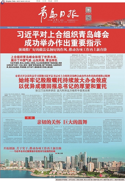 | 上合组织青岛峰会报道 2018年6月,习近平总书记亲临青岛主持上合组织青岛峰会,之后视察山东、视察青岛,对青岛提出了“办好一次会,搞活一座城”、建设现代化国际大都市的重要指示要求,赋予青岛建设上合示范区等一系列“国之重任”。为做好上合组织青岛峰会宣传报道,《青岛日报》成立了由20多人组成的前方报道组,精心推出特稿、专栏、特刊等多种形式的新闻报道,特别是创新推出了上合组织青岛峰会·号外珍藏版,八连版的创意在全国党报中引发轰动。 |
