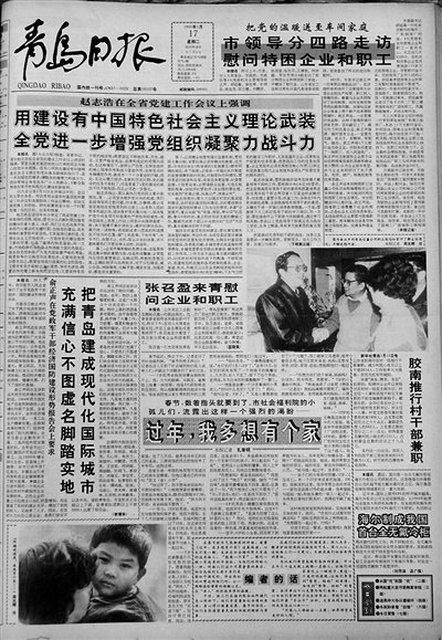 | 发起“呼唤爱心行动” 1995年1月17日,《青岛日报》头版刊登《过年,我多想有个家》报道,拉开了“呼唤爱心行动”系列报道的序幕。后续推出《孤儿,牵动着岛城人的心》《没妈的孩子也是宝》《社会伸出温暖的手》《妈妈,您好!》《福利院孤儿欢度小年》等几十篇报道。《青岛日报》“呼唤爱心行动”系列报道不仅让孤儿感受到了回家过年的温暖,更点燃了这座城市对这些特殊儿童群体的关注。 |