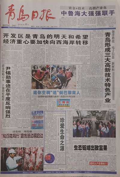 | “挺进西海岸” 2001年,青岛市政府提出了全市经济发展重心向开发区转移的构想并形成了加快青岛经济技术开发区发展的决定,之后又作出了抓住机遇、挺进西海岸、加快西海岸发展,构筑大工业体系、形成青岛新的经济发展重心的战略部署。配合这一进程,《青岛日报》进行了及时的跟踪报道和长期深入的纵深报道,采写了大量通讯、评论等各类新闻稿件。 |