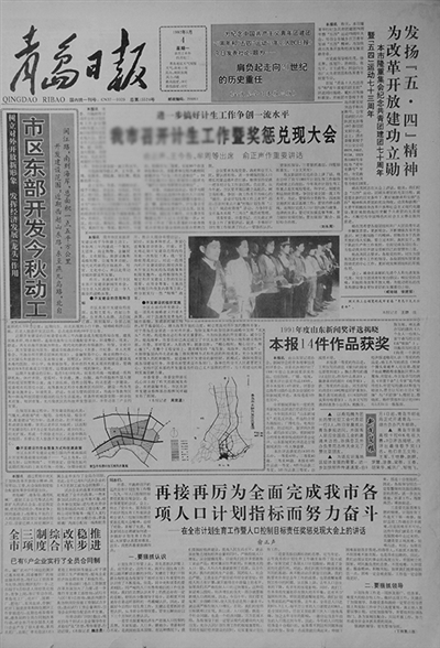 | 东部大开发 1992年,以青岛市委、市政府机关东迁为标志而开始的市区东部开发拉开序幕。这是一个建设大青岛的重大决策。经过数年努力,一个以五四广场为中心的城市新区展现在市民面前。《青岛日报》自始至终跟踪报道,先后刊发《一定要把东部规划建设好》《东迁问答》《东部速度》《拓展大青岛走向新世纪》等报道,为推进东部开发发挥了应有的作用。 |