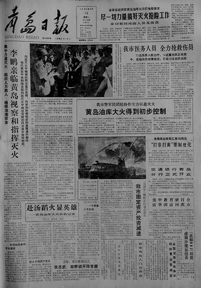 | 黄岛大火,刻骨铭心的记忆 1989年8月12日,黄岛油库一期一区油罐因雷击引起罕见大火,到8月16日下午6时全部扑灭,整整燃烧了4个昼夜。青岛市广大公安消防干警、驻军指战员和干部群众奋不顾身、舍生忘死,尤其是消防干警与烈火进行了殊死搏斗。《青岛日报》记者通过大量的消息、通讯、图片,把火灾的情况和军警民奋力灭火的动人场面及社会各界支援灭火抢险斗争的行动及时向广大读者做了报道。 |