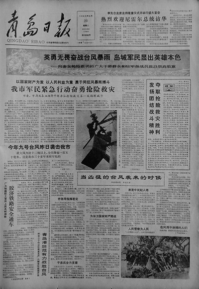 | 迎战台风,青岛日报冲锋在前 1985年8月19日,第九号台风在青岛登陆,青岛人民展开了一场抗击台风的斗争。《青岛日报》从台风预报到台风登陆及抢险救灾,一直跟踪报道,在8月19日至9月3日的十多天时间里,编发了抢险救灾稿件190多篇。这一系列报道在当时起到了安定民心、稳定情绪、鼓舞斗志的作用,受到山东省委、省政府和青岛市委、市政府的表扬和嘉奖。 |