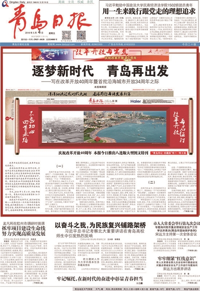 | 浓墨重彩报道改革开放40周年和青岛获批沿海开放城市34周年 为庆祝改革开放40周年和青岛获批沿海开放城市34周年,2018年5月4日,《青岛日报》推出重头稿件和八连版大型图文特刊报道。其中,在一版推出大型编辑部文章《逐梦新时代 青岛再出发——写在改革开放40周年暨首批沿海城市开放34周年之际》。八连版的特刊以时间轴的形式全面回顾了青岛入列首批14个沿海开放城市、青岛获批计划单列市;奥帆赛在青岛开幕、“电影之都”花落青岛;国家深海基地管理中心启用、青岛海洋国家实验室正式运行等一系列青岛在经济、政治、文化、社会、生态文明建设领域的重大事件,在社会上产生了广泛的影响力。 |