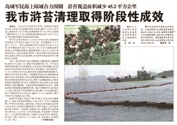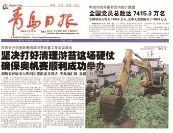 | 军民合力抗浒苔 2008年6月12日,一场突如其来、历史罕见的浒苔自然灾害侵入北京奥运会、残奥会帆船比赛城市青岛。哪里灾情危急就向哪里冲,从浒苔暴发到最后被彻底清除,《青岛日报》派出多名记者赴现场采访报道,为军民抗击浒苔鼓劲加油。 |