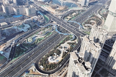 从空中远眺,位于海尔路的金家岭立交桥项目,犹如血管般承载着车流的涌动,连接起城市的各个角落。这个由华通集团所属静态交通公司投资建设的国内首个集地上立交、地下公共停车和地铁换乘以及商业服务于一体的综合交通中心,建成以来有效缓解了青大附院、国信体育场及周边居民区的拥堵和停车难题。