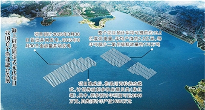 开工仪式现场,随着吊车“手臂”不停地舞动,一块块光伏板被组装到钢平台上。每一榀钢平台长60米、宽36米,由658块光伏板组成。“组装好的钢平台将装船出海,运输到指定海域安装,项目海上部分需要安装1678榀这样的钢平台。”中电建新能源山东分公司海上事业部主任付德光说,项目预计2025年3月30日首批并网发电,2025年8月30日全容量并网发电。整个项目建成后,预计年均可提供约19.2亿度发电量、年均产值约7.2亿元,每年可减少二氧化碳排放量约170万吨。