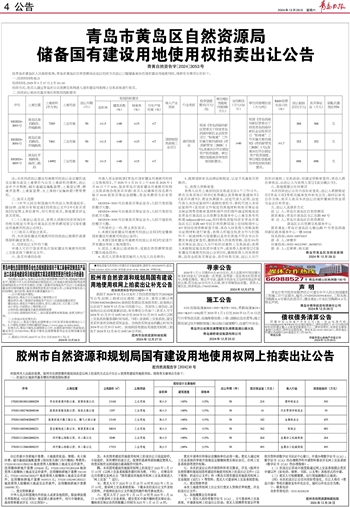 青岛日报公告04青岛市黄岛区自然资源局储备国有建设用地使用权拍卖出让公告 2024-12-28 2 2024年12月28日 星期六