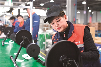 ■1月3日,在青岛市城阳区夏庄街道青岛迈金智能科技股份有限公司生产车间,工人在调整智能骑行台。 新华社照片