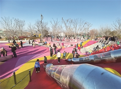 同样凭借特色主题区域“出圈”的,还有张村河生态公园。公园内新建的儿童天地趣味十足,吸引众多家长带着孩子前来游玩。探险园、乐滑园、乐水园、科技互动园等内容丰富、色彩缤纷的主题园区让小朋友们流连忘返,欢声笑语萦绕在张村河畔。目前,张村河生态公园先行启动区已对外开放,20余项配套服务设施为市民带来多样化的休闲娱乐与自然生态体验。