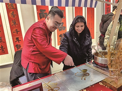 ■龙辞旧岁,蛇舞新春。1月22日,青岛市文化馆内张灯结彩、热闹非凡,精彩的曲艺表演与民俗活动轮番上演,由市文化和旅游局主办的“欢乐四季 共享文旅”2025年青岛市民俗文化大拜年活动正式启动,拉开了群众文化活动庆新春的序幕。图为外国友人在活动现场体验糖画制作。王 雷 摄影报道