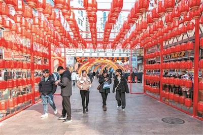 ◀李村商圈数百个大红灯笼组成灯笼阵,迎接春节到来。 杨志文 摄