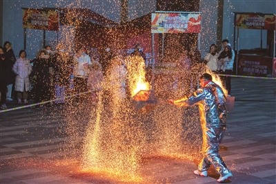 | ③1月25日傍晚,青岛文化市场上演传统民俗活动,喜迎春节。图为打火壶表演现场。 于 滈 摄 |