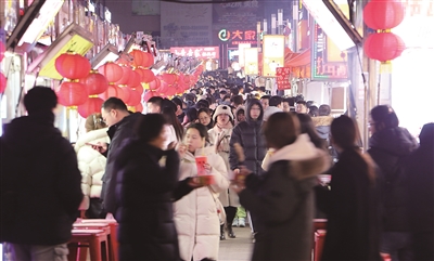 | ①台东步行街小吃摊上,大红灯笼高高挂起,洋溢着喜庆过年气氛。 梁 超 摄 |
