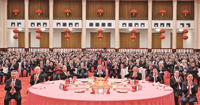 人民大会堂宴会厅灯光璀璨、暖意融融,各界人士2000多人欢聚一堂、共迎佳节,现场洋溢着欢乐祥和的节日气氛。