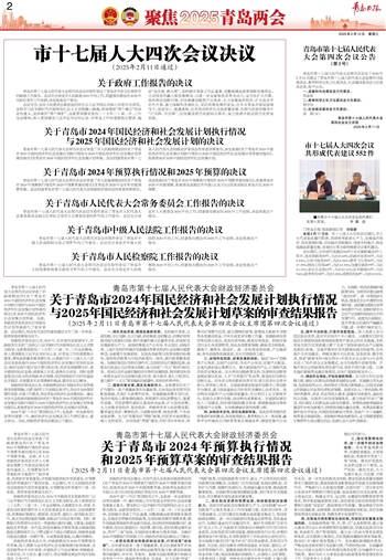 青岛市第十七届人民代表大会第四次会议审查了市政府提出的《关于青岛市2024年预算执行情况和2025年预算草案的报告》及2025年预算草案。会前,市人大财政经济委员会在市人大常委会预算工作委员会预先审查的基础上,对预算报告和草案初步方案进行了初步审查,形成初步审查意见;市财政局按照初步审查意见,对预算报告和草案进行了修改完善。大会期间,市人大财政经济委员会根据各代表团审查意见,对预算报告和草案作了进一步审查。现将审查结果报告如下: