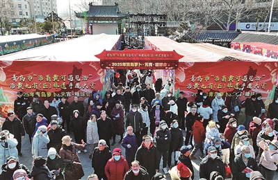 在海云庵会场,非遗年味的底色更足。2025年青岛萝卜·元宵·糖球会开街当天,青岛市“沿着黄河遇见海”沿黄九省(区)非遗手造大赏就同步启动,来自沿黄九省(区)及省内、市内的非遗手造名品集聚展销,文艺文化汇演精彩纷呈,海洋大集名吃佳品荟萃,现场市民游客人头攒动。