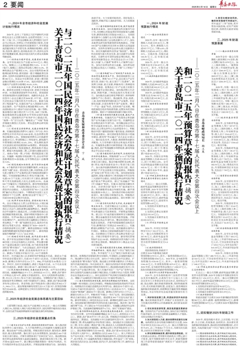 (二)创新动能加速积蓄,产业转型加快推进。新获批全国重点实验室8家、省重点实验室59家。15项成果获国家科学技术奖。获批国家首批标准国际化创新型城市。高新技术企业、科技型中小企业总量达到8650家、9777家。全国先进制造业百强市排名升至第6位。船舶与海洋工程装备产业、仪器仪表产业入选国家先进制造业集群。生产性服务业增加值增长6.6%。青岛国际航运中心建设行动启动实施。港口货物、集装箱吞吐量分别达到7.1亿吨、3087万标箱。集装箱海铁联运量连续10年保持全国沿海港口首位。国家级知识产权保护中心建成启用。“海葵一号”交付运营。“瀚海星云”“问海”等海洋领域大模型正式发布。青岛蓝色种业研究院投入运营。