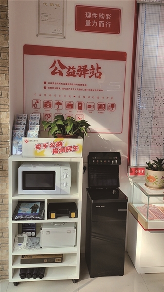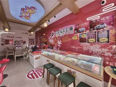 步入站内,经典的红白配色夺人眼球,一盆盆的绿植点缀,让站内环境温馨又健康。进门左手边就是新增设的公益驿站区域,内有微波炉、血压计、医疗箱、工具箱、雨衣雨伞、饮水机等设备和物品提供给彩友、户外劳动者和市民朋友免费使用,希望大家在辛勤劳作之余,也能在此获得片刻休憩。右手边的一整面绘满国风图案的红墙尤为引人注目,墙上“中国福利彩票”logo醒目地置于国风图案的背景之中,与整体装饰相得益彰,成为不可忽视的视觉焦点。宽敞的即开票展示柜里摆满了琳琅满目的即开票,令人目不暇接。正对门口的墙上张贴的则是福彩的发行宗旨、公益文化理念、彩票资金构成等科普知识和丰富多彩的公益活动照片。在宣传福彩公益的同时,也为站内环境增添了更多色彩。