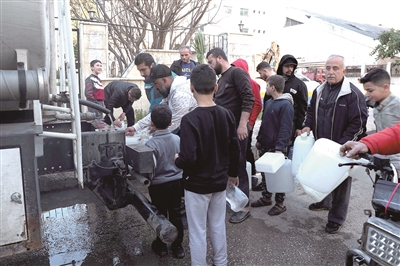 ■在叙利亚拉塔基亚杰卜莱,人们排队从水罐车打水。新华社照片