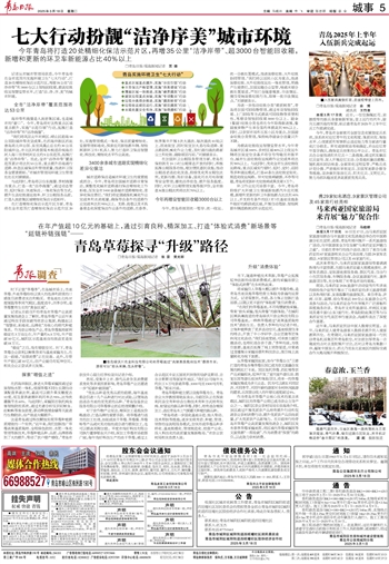 “青岛将进一步强化基地示范、能人带动、技术帮扶等措施,逐步实现育苗、种植、管理、销售的全流程服务模式,加快形成草莓品种多样化、基地规模化、管理规范化、经营产业化、投入科技化的高质量发展新格局。”市农业农村局相关负责人说。