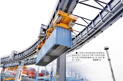 ■山东港口青岛港智能空轨集疏运系统实现了空轨技术与港口业务有机融合,打通了集装箱运输港、船、站、场间“最后一公里”。    张进刚 摄