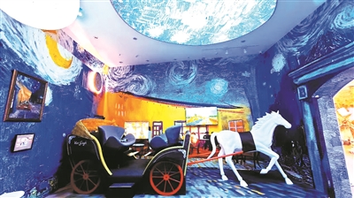 除了沉浸式体验,体验馆还设置了数字艺术画廊区、梵高主题文创区等板块,将梵高画作的经典元素融入场景设置,为观众呈现一个丰富多彩、身临其境的艺术世界。在多种数字技术的加持下,观众不仅是欣赏者,还能成为画面中的“旅人”,亲历梵高的创作情境,感受他对自然、生命与情感的深切表达。