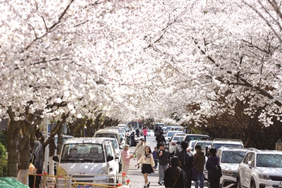 ■近日,李沧区翠湖社区内800多株樱花争相绽放,将整个社区装扮成花的海洋,吸引了不少市民游客前来打卡。