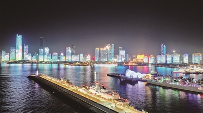 4月22日晚,庆祝人民海军成立76周年主题灯光秀亮相浮山湾,向人民海军致敬,停靠在青岛奥帆中心码头的海军临沂舰、成都舰璀璨亮相。   金 璐 摄