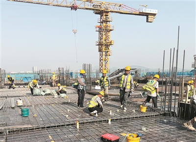 本报5月1日讯 8台黄色塔吊长臂伸展、笔直矗立,木板、钢筋等建筑材料整齐地码放在一起;钢筋交错的楼面上,工人们头戴黄色安全帽、身穿反光背心在钢铁网格间穿梭,有的弯腰绑扎钢筋,有的有条不紊整理材料……“五一”假期第一天的青岛大学医学医疗中心一期项目建设现场,一片热火朝天的忙碌景象。