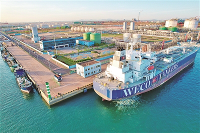 董家口港海湾港务的码头依然船来船往。自4月30日“哈夫尼绿松石”轮靠泊算起,海湾港务职工已连续奋战了53个小时,成功完成2万余吨液体烧碱的装船任务。刚刚送走奔赴沙特朱拜勒港的“哈夫尼绿松石”轮,装载着4900吨乙烯的“宏利”轮又传来提前到港的消息。值班长王路兴立即分配任务,接卸工作有序展开。技术骨干毕高阳穿过管廊逐一复核每个阀门的状态。现场调度员李连旺手持定位旗与船方协调定位带缆,25毫米粗的缆绳在绞盘机轰鸣中蛇形游动。“左舷二缆松两米。”“后桩收紧三十公分。”在海湾港务现场操作人员精准指挥下,仅仅用时18分钟,“宏利”轮便完成靠泊,开启接卸作业模式。