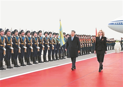 俄方在机场举行隆重迎接仪式。军乐团奏中俄两国国歌。习近平检阅仪仗队并观看分列式。