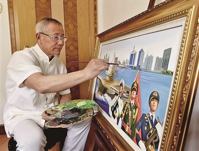 记者看到,这幅画宽约70厘米、长130厘米,以青岛浮山湾、汇泉湾和太平湾为背景,将辽宁舰航母战斗群的雄姿与青岛城市天际线完美融合。画面前景是3名英姿飒爽的海军战士,背景中海关大楼、海天中心等标志性建筑鳞次栉比,生动展现了改革开放以来青岛的沧桑巨变。