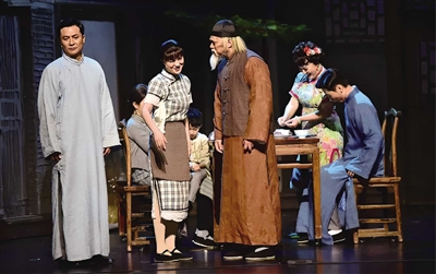■朱媛媛(左二)参演的话剧《四世同堂》曾在青岛上演。   王 雷 摄