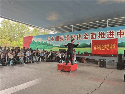 2019年,有着管理经验的张泰芳、拥有指挥才能的吴本集和长笛吹奏技巧的牟秀玲“三剑客”策划成立艺术团,多方考察后确定了海泊河公园内的杭鞍高架桥下为场地。“这里空间开阔、空气怡人、人流量大,唱歌还有回声,表演效果比较好。”张泰芳告诉记者,自此,青岛海之声艺术团在海泊河公园扎根,每周日的9:00至11:00都组织团员开展活动,包含合唱、独唱、才艺展示等环节,最多时有上千人参与,有的歌友还专门从西海岸新区、城阳区奔赴而来。