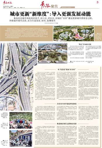 城市更新是改善民生、增强群众获得感的重要切口。“十四五”以来,青岛上千个老旧小区实现“二次生长”。在“完整社区”理念的指引下,青岛的老旧小区从传统的“单一”社区向更加完善的“完整”社区转型:为老楼更换上下水管道、加装电梯,社区里建起老年食堂,在街角新增口袋公园、立体绿化……这样的改变,市民感受最真切,人们对城市的归属感随之增强。