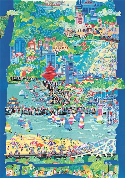 “以‘胶南年画’为代表的青岛农民画能够越来越好,是一种艺术上的坚持,或者说‘长期主义’。随着时代发展,从事‘胶南年画’的艺术家越来越专业,现在的画家群组成人员中大部分是高等院校美术本科生和研究生。这些年轻人拥有多元的艺术理念,给‘胶南年画’注入了新鲜的元素,能够多次在全国大展中获奖也不足为奇。”著名画家窦凤至多年来一直关注“胶南年画”的发展。他认为,“胶南年画”不断破圈,已经不再是单纯的农民画,许多题材不仅具有时代性,而且具有城市性和时尚性。比如,最近在全国大展崭露头角的这幅《好客山东·魅力青岛》,就是着力聚焦城市发展热点,突出文化元素设置的好作品。这种具有现实题材的主题作品和扎实的艺术手法相结合,能够得到业内一致好评也是必然结果。