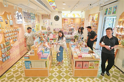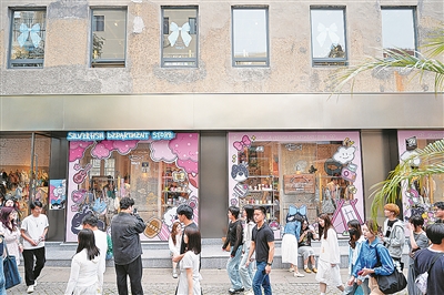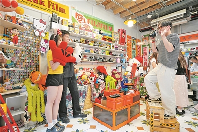 在这场属于Z世代的“派对”上,上演着多元社交图景——年轻人们或挤在10余平方米的“失物招领”照相馆,手持夸张道具,让摄影师用镜头记录美好瞬间;或在“定格计画”门前排队等候,只为得到画师即时创作的、独一无二的专属手绘小像;或穿梭于“小岛日记”“猫的天空之城”等文创店铺,精心挑选手账本、城市限定明信片等“社交货币”;又或在海棠咖啡店外与巨型机车头盔酷炫合拍,再进店细细品味咖啡的醇香,享受快节奏打卡之余的慢时光。