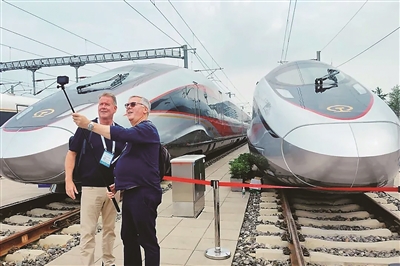 在国家铁道试验中心展区,中车四方股份公司研制的全球最快高铁列车——时速400公里CR450AF动车组样车、“升级版”智能复兴号CR400AF-S动车组、地面最快交通工具时速600公里高速磁浮等“明星”高速列车实车惊艳亮相,吸引大批国内外观众驻足观看,争相来到列车前拍照打卡。中国高速列车“硬核”科技实力圈粉。
