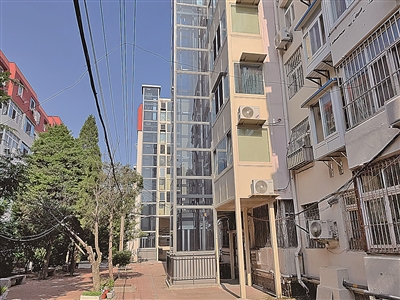 燕儿岛路50号楼建于20世纪90年代,共有4个单元40余户居民,一半住户为老年人。7月5日,记者在该楼栋北侧看到,一单元和三单元的户外有两部电梯,电梯井道、电梯轿厢、连廊、幕墙都已安装完毕,电梯门上的塑料薄膜还未撕下。其中,一单元电梯的面板显示“D”字样,刷卡区红灯常亮;三单元电梯的面板显示“1”字样,记者按动电梯按键,电梯无反应。