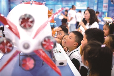 | ■7月18日,在山东省青岛市市北区,上海路小学的孩子们走进自然资源部第一海洋研究所中国大洋样品馆,参观“蛟龙”号载人潜水器模型。 暑假期间,孩子们参加丰富多彩的活动,在快乐中学习知识、充实假期生活。 新华社照片 |
