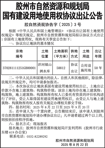 胶州市自然资源和规划局国有建设用地使用权协议出让公告
