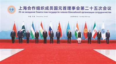 9月的天津,秋高气爽。梅江会展中心外,与会各国国旗、上海合作组织会旗迎风飘扬。上海合作组织2024-2025年轮值主席国徽标格外醒目。